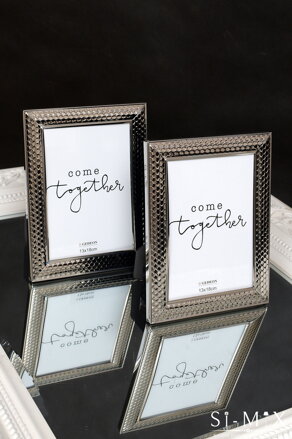 Elegantný, strieborný fotorámik s jemným vzorom, rámik vhodný na fotografiu 13x18cm, dá sa postaviť aj na výšku, aj na šírku ,zadná strana čierny semiš.